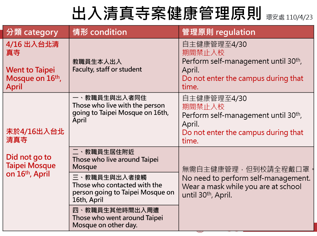 中央流行疫情指揮中心公告,案1091相關活動史為4/16台北清真寺,現公告本校健康管理原則如下,請依規定執行並將您的清真寺足跡告知單位防疫窗口。